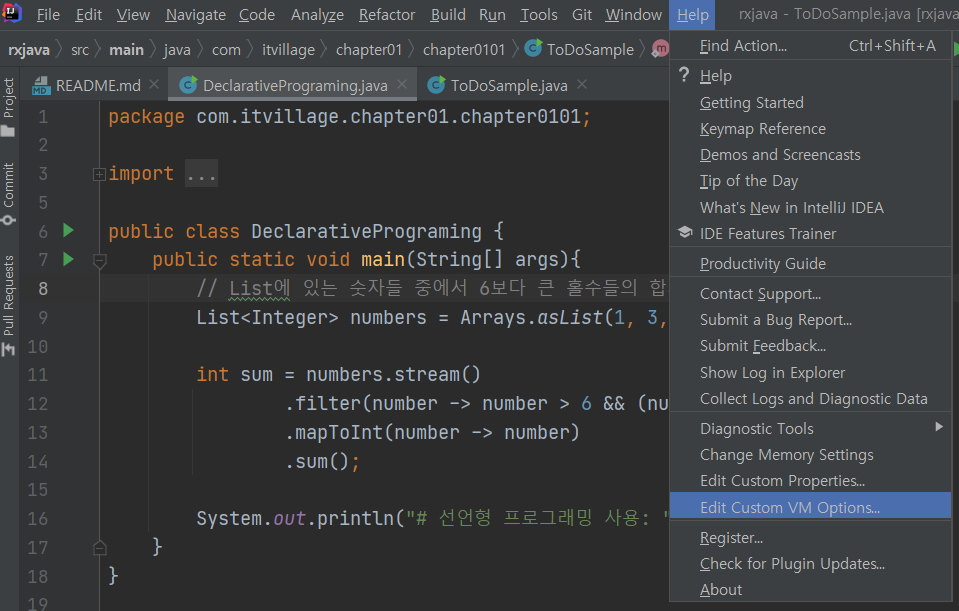 그 다음으로 Help - Edit Custom VM Options로 들어갑니다