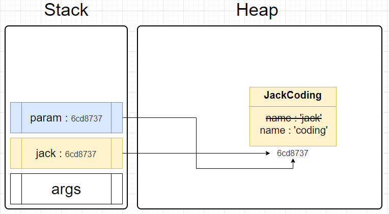 changeJackCoding() 메서드가 실행되면 매개변수로 들어간 참조값 6cd8737이 복사되고