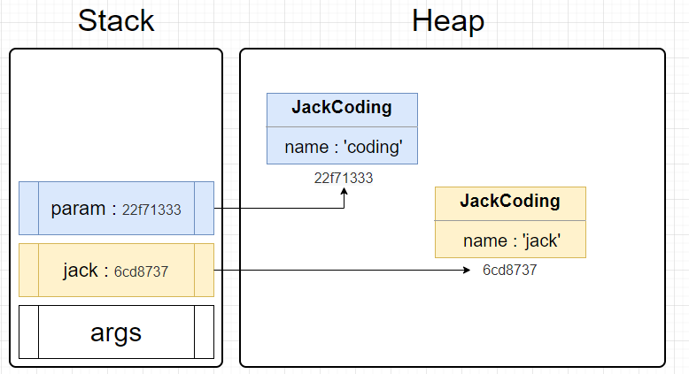 먼저 JackCoding 객체의 인스턴스 jack을 생성하면, 참조 변수와 참조값이 Stack에 생성되고,