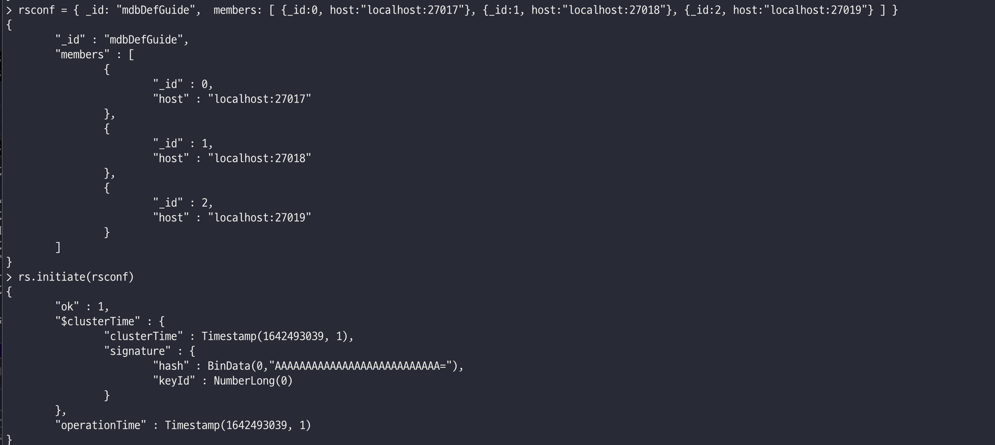 # rsconf = { _id: "mdbDefGuide", members: [ {_id:0, host:"localhost:27017"}, {_id:1, host:"localhost:27018"}, {_id:2, host:"localhost:27019"} ] }